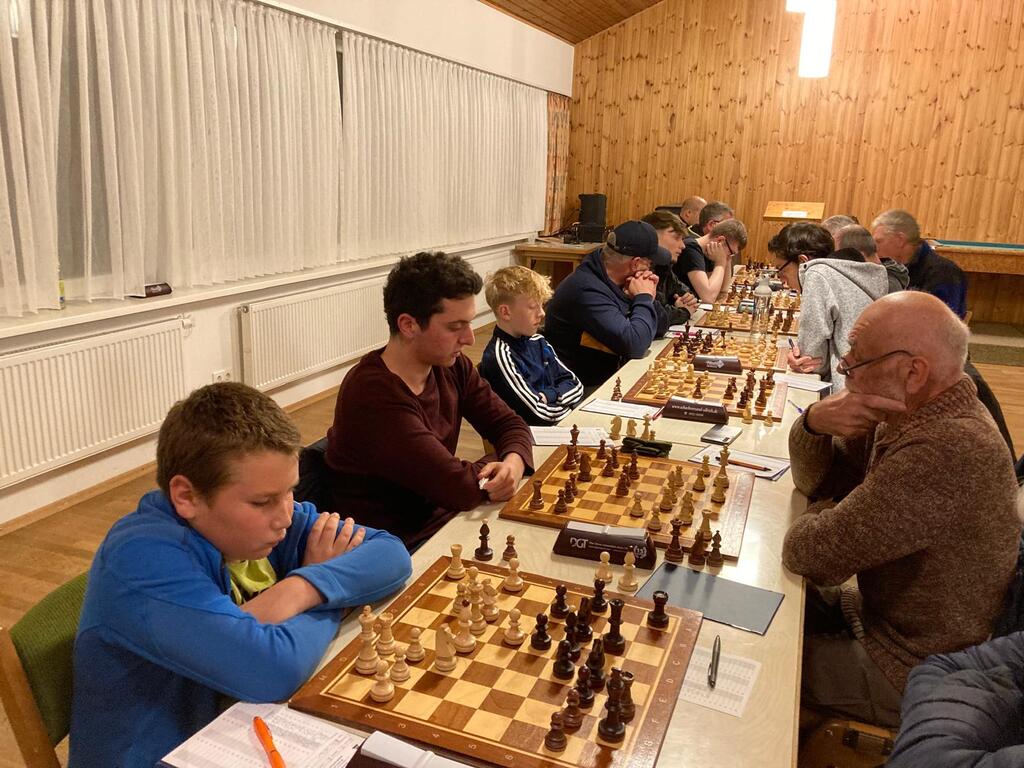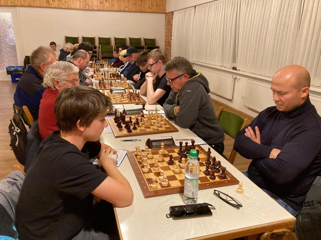 Elias Walter hatte an Brett 8 drei Bauern weniger, Marc Baums König stand an Brett 5 alles andere als sicher und Sergej Merdian stand an Brett 1 ziemlich passiv. Marc Baum schaffte es schließlich noch, seinem Gegner ein Remis abzuringen, Elias musste sich seinem erfahrenen Kontrahenten geschlagen geben und Sergej verlor zu viel Material, um noch kämpfen zu können und gab auf.