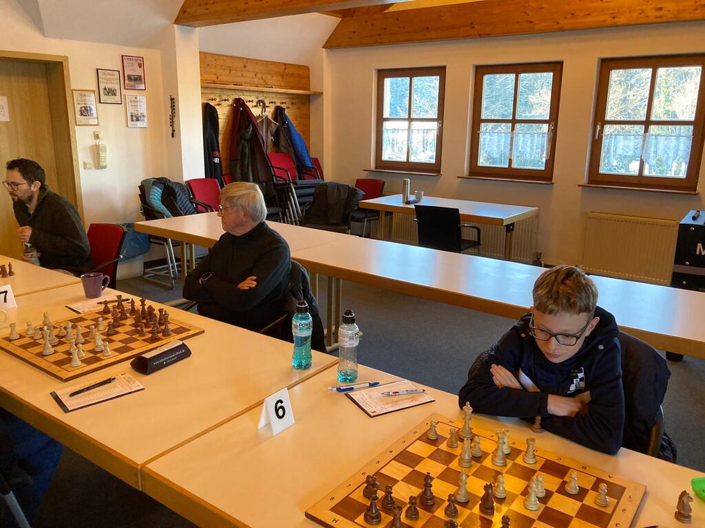 Der Mannschaftskampf wurde auch schon bald inhaltsreich: Eric Stertkuhl an Brett 2 nutzte gekonnt die Schwächen der gegnerischen Stellung aus und beschäftigte seinen Gegner fortlaufend mit Abwehrmaßnahmen, dieser übersah darauf hin einen Damenverlust und musste aufgeben. Martin Sippl an Brett 3 und Ulrich Reichmann an Brett 5 steuerten zwei Unentschieden bei. Stefan Ratscheu an Brett 4 und sein Gegner gestalteten ihre Partie stellenweise recht unübersichtlich, jeder Fehlgriff konnte die Partie sofort entscheiden. Dieser kam dann auch in der Zeitnotphase des Gegners und Stefan konnte mit Materialvorteil die Partie für sich entscheiden. An Brett 1 brachte Nick Merdian ein sehenswertes Materialopfer, um so die Partie zu verschärfen und Angriff zu erhalten auf den gegnerischen König, dieser befand sich immer noch in Brettmitte. Eine Weile befand sich die Partie auch in einem dynamischen Gleichgewicht, allerdings konnte der Gegner dann doch noch seinen König in Sicherheit bringen und so entschied der Materialvorteil zu Ungunsten von Nick. Ebenso sehenswert gestaltete Erich Fischer an Brett 7 seine Partie, allerdings machte ihm und so manchem Zuschauer erst einmal seine offene Königsstellung größte Sorgen. Durch eine List erzielte er Materialvorteil und seine Gegnerin versuchte die Partie mittels Bauernumwandlung zu retten. Erich agierte umsichtig und konnte schlussendlich alle gegnerischen Drohungen neutralisieren und mittels großen Materialvorteil die Partie für sich entscheiden. Es liefen sodann nur noch die Partien von Jonah Cwiklik an Brett 6 und Nicolas Bisterfeld an Brett 8. Es sah stellenweise danach aus, als wären auch diese beiden Partien zu gewinnen, dies hätte mit 6:2 einen eindeutigen Mannschaftssieg ergeben. Leider verlor Nicolas durch einen Fehlgriff einen ganzen Turm und musste wenig später den Kampf einstellen. Jonah hatte eine Endspielstellung auf den Brett, welche Gewinnchancen inne hatte. Allerdings zweigte er in eine Variante ab, welche das Spiel Unentschieden werden ließ.