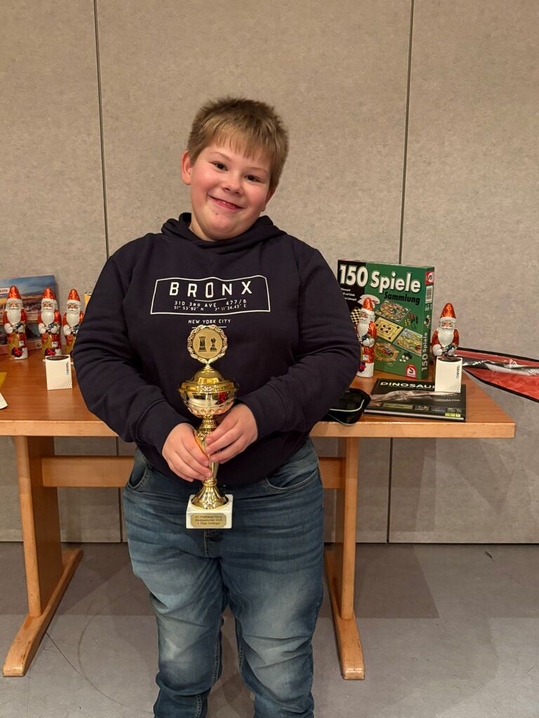 Dann kam es zur Siegerehrung des vereinsinternen Nikolausturniers, an dem 17 Kinder unter 14 Jahren teilnahmen, 5 bei den Fortgeschrittenen und 12 bei den Anfängern. Jedes Kind durfte sich einen Sachpreis aussuchen. Zusätzlich einen Pokal nahmen die Sieger der Gruppen, Elias Walter und Sebastian Lochner mit nach Hause.
